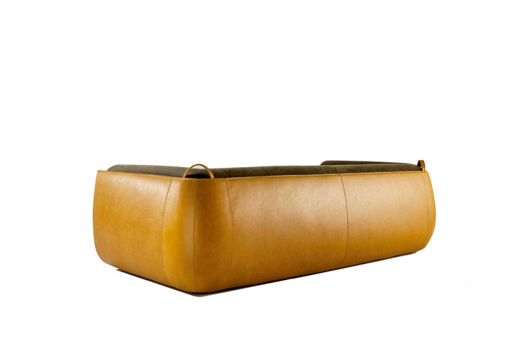 The design of the "Meir" sofa takes its inspiration from the female accessory par excellence: the bag. The structural details (such as the thin and rigid shell upholstered in leather that embraces the seats and the backrests) and the purely aesthetic details (such as the visible hinges and the handles placed on the sides) connote its personality and enhance the originality of the design of this sofa. The careful and meticulous finishing of all the details of this sofa expresses the consolidated sartorial mastery of our craftsmen