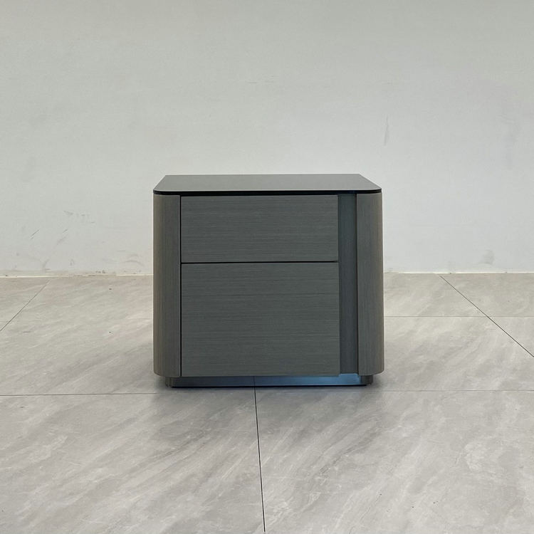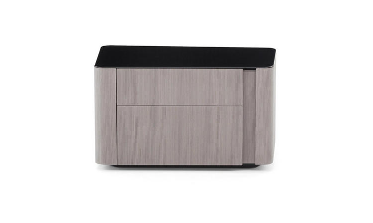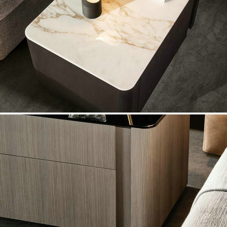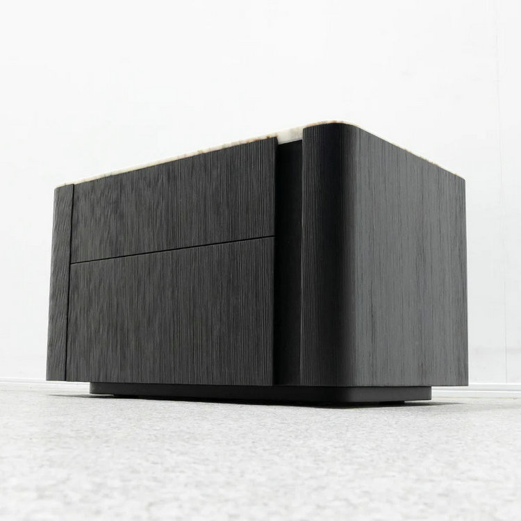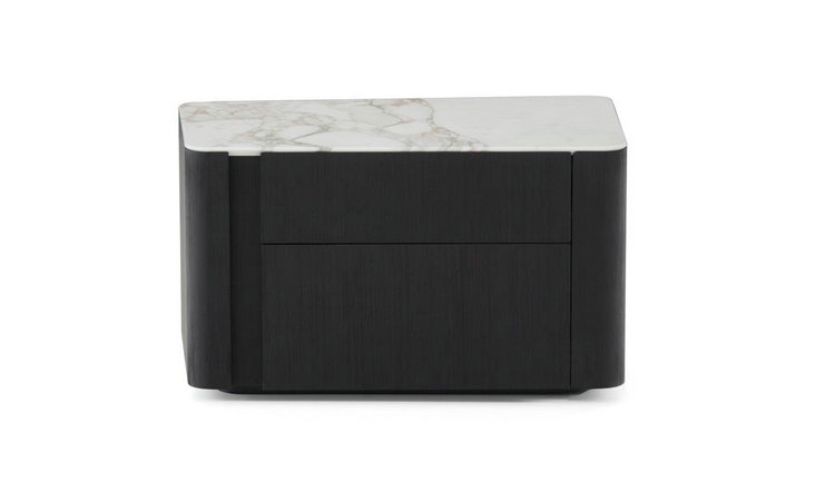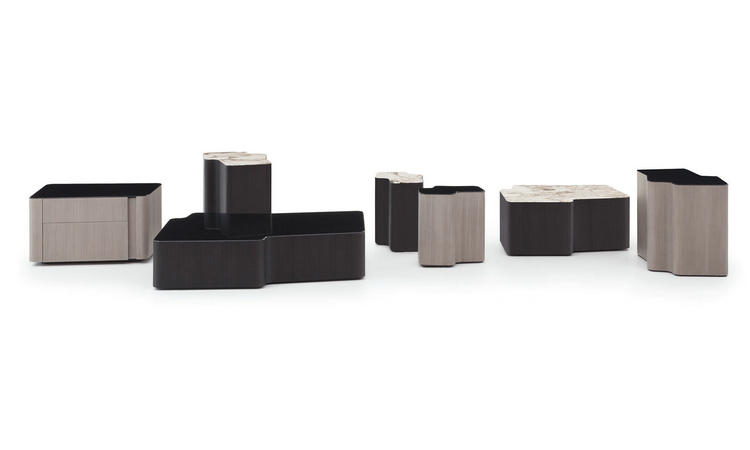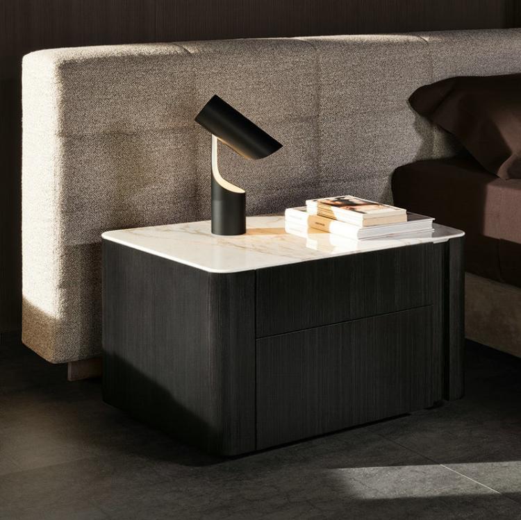 Lou "Nightstand" and Coffee Table collection, a stunning addition to any interior space designed by the talented Christophe Delcourt. The Lou bedside table boasts a larch veneer structure, available in either a prefinished Dove Grey hue or an open-pore Licorice lacquer finish, offering a chic and modern aesthetic. Its flush-set tops are crafted from exquisite Calacatta marble or striking black pàte de verre, adding a touch of luxury to your bedside.